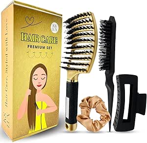 Descubre el set de belleza perfecto para mujer, que incluye un cepillo antiencrespamiento con cerdas naturales, una goma de pelo dorada, un cepillo para recogidos, una pinza grande negra y un exclusivo embalaje de regalo. El cepillo anti frizz suaviza y desenreda el cabello, proporcionando un acabado sedoso y brillante. El peine, junto con la goma dorada, es ideal para lograr coletas elegantes y con estilo. La pinza negra ofrece una sujeción firme y cómoda para cualquier ocasión. Este kit es un regalo ideal, con herramientas de calidad para estilizar y cuidar el cabello con facilidad y elegancia.